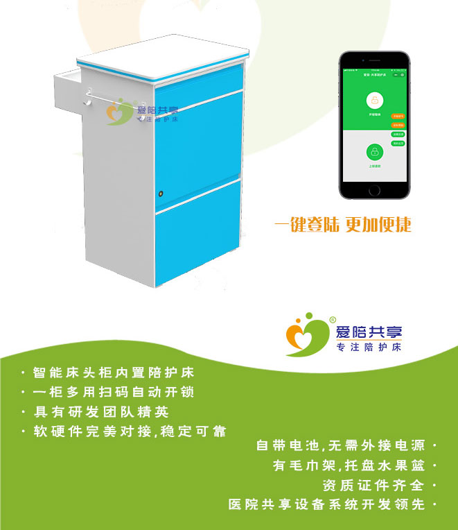 共享陪護床適用很多大醫院,可以選擇直接購置新型的設備為患者和家屬提供便利,也可以合作供應商免費進行投放,在使用的過程中可為醫院以后的發展打下良好的基礎。共享陪護床是一款多功能的產品,即可當床頭柜使用,又可做陪護床,相對成本價要高一些,但這種共享智能陪護床是未來的發展趨勢。
