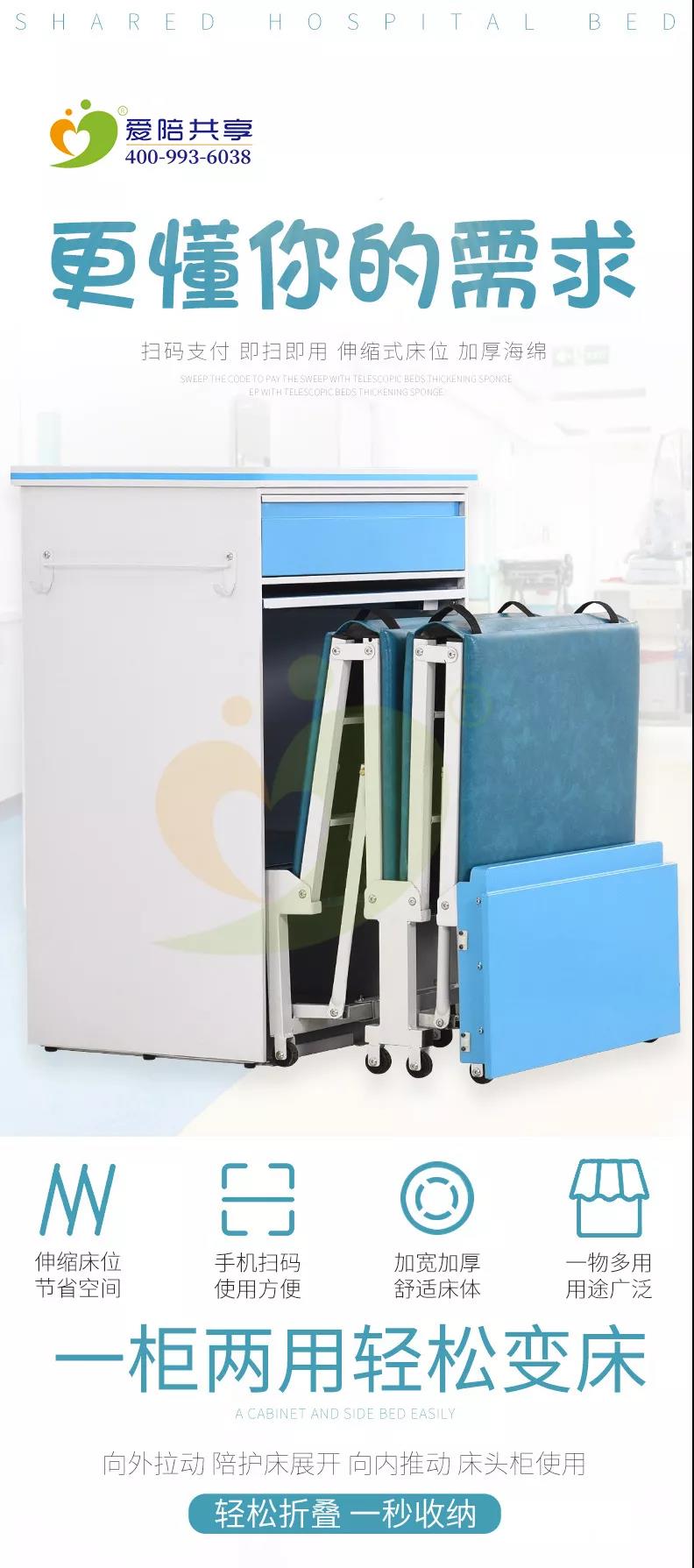床頭柜式共享陪護床,醫院陪護床,是作為病床邊柜子替換,不顏外占空間,而且可以就在病床旁邊,方便陪護。
