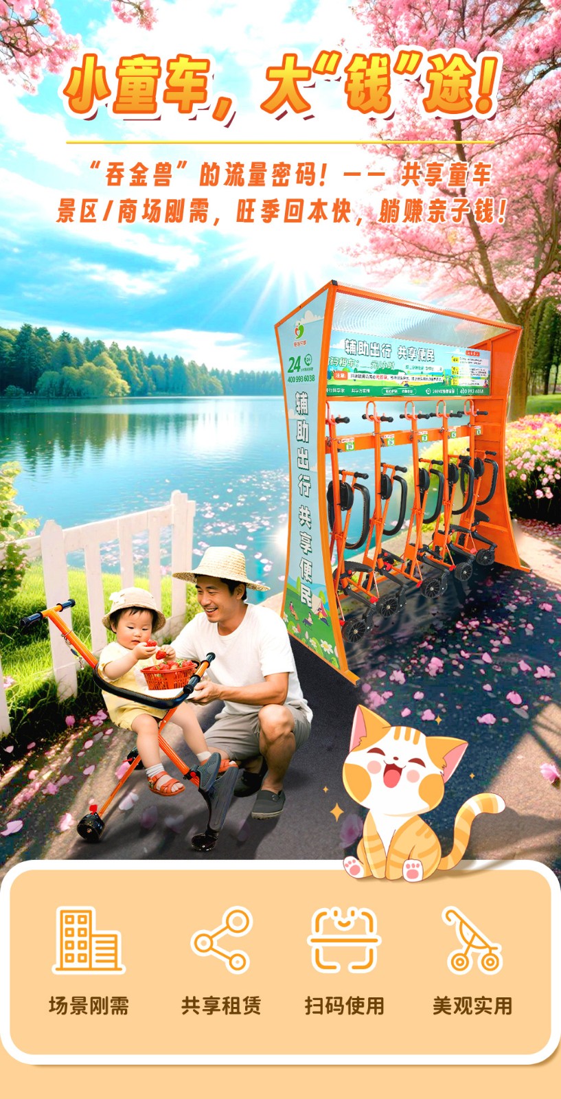 景區共享童車:專為2-7歲兒童設計,輕便易折疊,解放父母雙手。